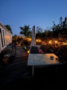Buitenruimte/tuin voorzien van houten vlonder, weelderige border met hortensia’s, potten met o.a. olijfboompjes en met diverse zithoekjes.