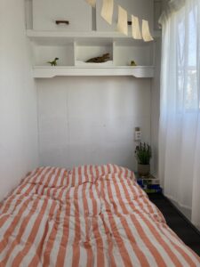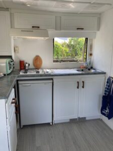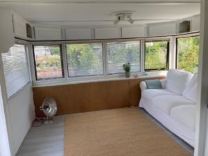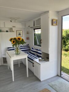 Sfeervolle Boston stacaravan van aluminium (afmetingen 10,5 x 3,5 meter):